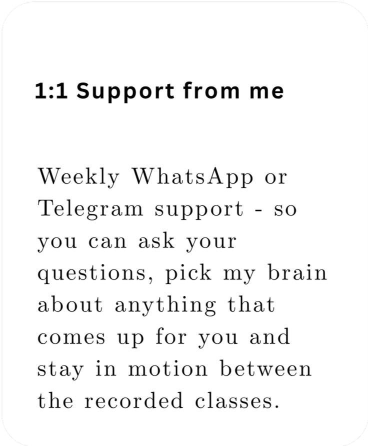 You’ll get new recorded class each week together with weekly 1:1 support from me, so you can ask questions, pick my brain and stay in motion between the recorded classes.