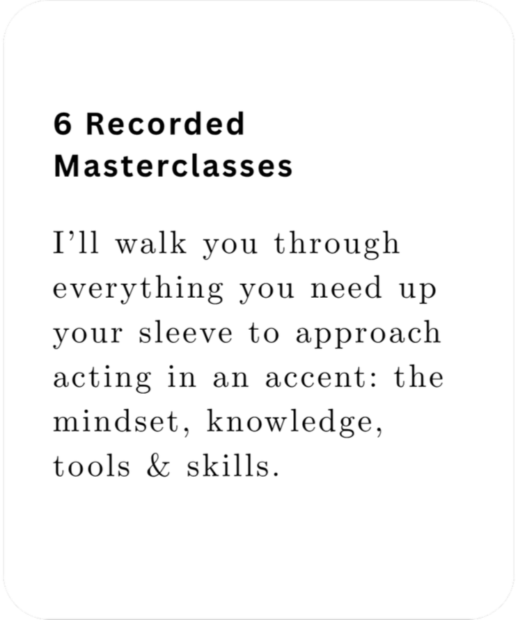 This experience is designed to EMPOWER you with the mindset, understanding, processes, tools and skills to approach acting in an accent with confidence and curiosity - so you can stay connected, embodied and ‘out of your head.’