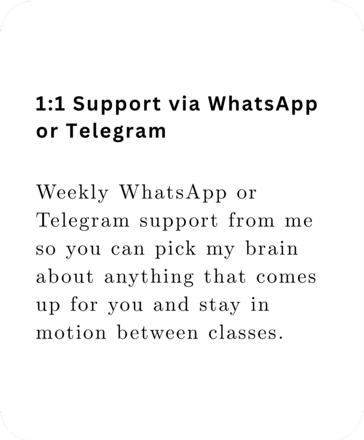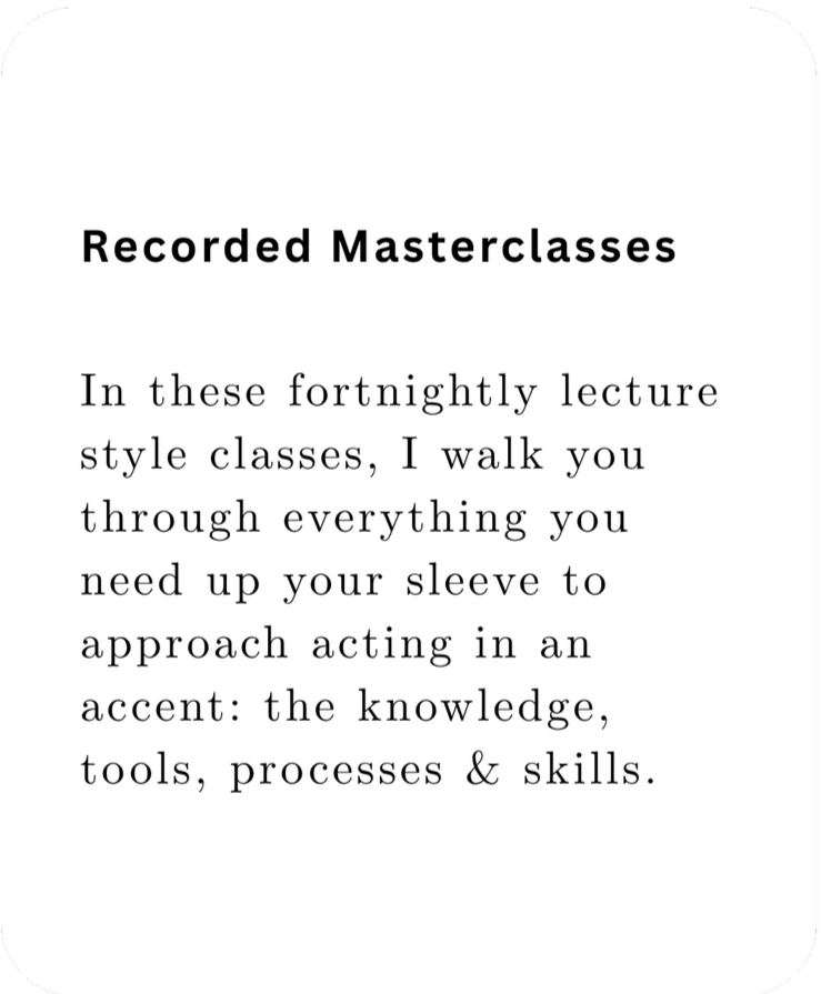 A new recorded class each week coupled with weekly WhatsApp or Telegram support from me, so you can ask questions, pick my brain and stay in motion between the recorded classes. Together we’ll totally transform the way you feel about acting an accent!